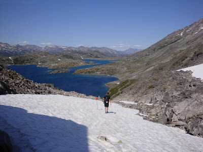 Coming up and over the pass was great, the first 16.5 miles were over, and we knew it would be mostly downhill from here on out. Here is the view looking north on the other side of Chilkoot pass. The cold, interior side. Note how barren it looks, and the beautiful blue lakes. It is rarely ever above 60F here in the summer. The interior far to the north heats up, and pulls the cool maritime air inland through the pass, air which at 3000 feet is usually only 45-55F during the day. This day it was 60-70F! Walking on these snowfields was sketchy in our running shoes. We wore